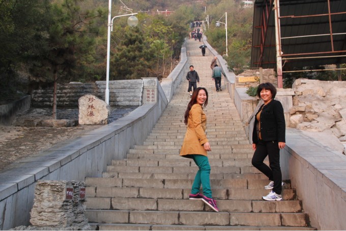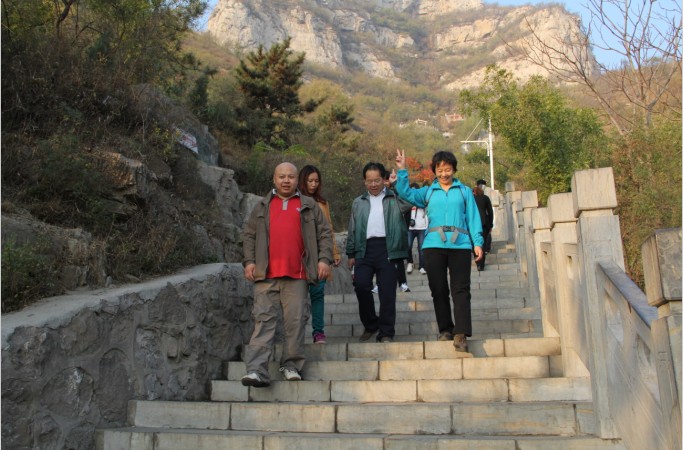清晨的山林,空气清新,喜鹊鸣叫着穿行在游人左右,会员们沐浴着暖暖的阳光拾级而上。抱犊寨山路全长3300米,共3086级台阶,走累了,大家相互鼓励,你帮我背会儿包,我拉你一把;途中间歇,大家便坐在一起或谈谈登山心得或聊聊家常,气氛十分融洽。