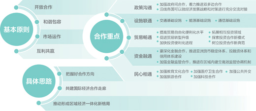 机制方面。在平等协商、互利共赢的前提下,积极推动与有关国家签署“一带一路”合作谅解备忘录或编制双边合作规划,完善双边工作机制,细化共建“一带一路”的方案和路线图。以此为起点,推动共建一批合作示范项目,让双边合作沿着“一带一路”驶向更加科学化、规范化的“快车道”。同时,我们倡导充分发挥上海合作组织(SCO)、中国—东盟“10+1”、亚太经合组织(APEC)、亚欧会议(ASEM)、亚洲合作对话(ACD)、亚信(CICA)、中阿合作论坛、中国—海合会战略对话、大湄公河次区域(GMS)经济合作、中亚区域经济合作(CAREC)等现有多边合作机制作用,使更多国家和地区参与“一带一路”建设。