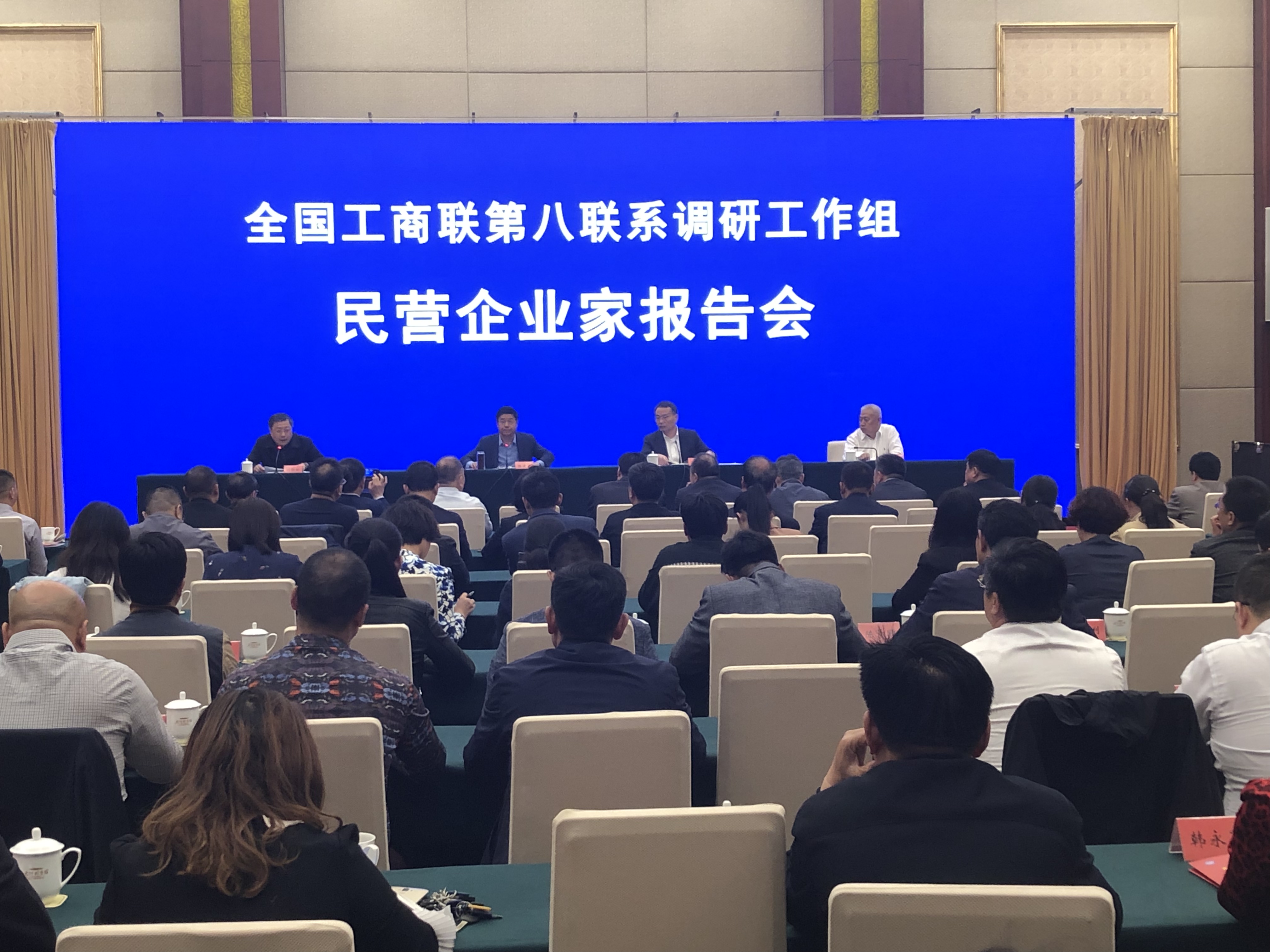 4月22日,全国工商联第八联系调研工作组民营企业家报告会在石家庄太行国宾馆召开,全国工商联党组成员、秘书长赵德江,全国工商联办公厅主任李春光及联系调研工作组成员出席报告会。河北省工商联主席刘劲松主持会议,省委统战部副部长,省工商联党组书记、常务副主席郭翠朵,省工商联副主席马强、张京红,副巡视员、秘书长刘庆丰出席报告会。我会常务副会长杨勇、秘书长朱中华参加会议。