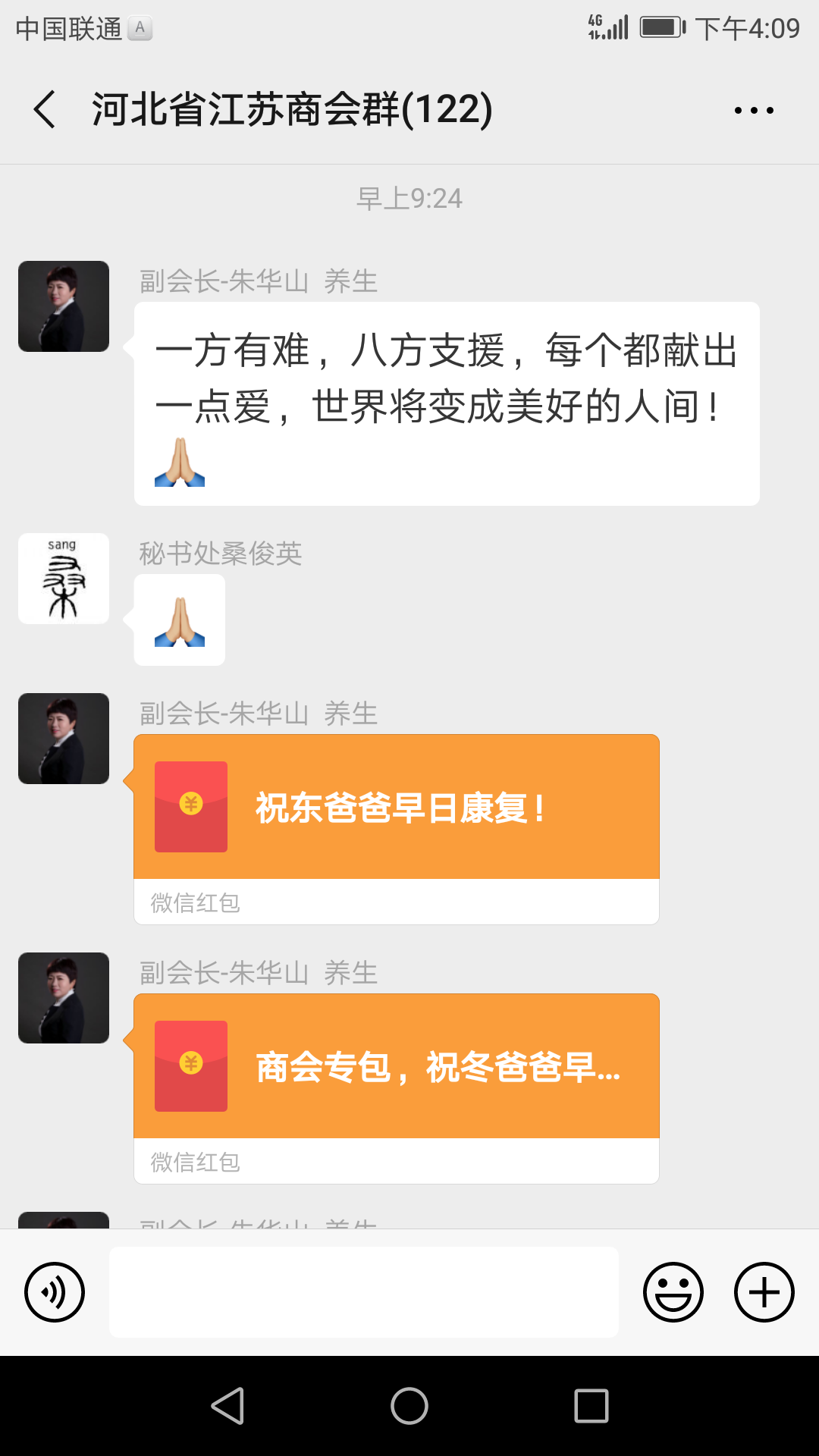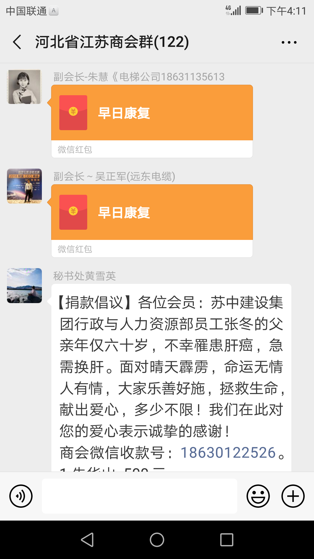 广大会员在看到倡议后,积极响应,你两百,我五百,纷纷伸出援手,并在微信会员群里向张冬的父亲表示深深的祝福。一时间,河北省江苏商会会员群里爱心如流,捐款接龙的名单越来越长……在不到24小时的时间里,捐款数额已达两万多元。