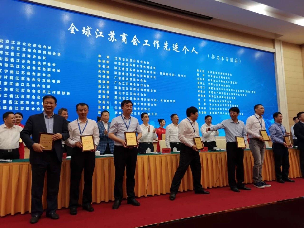5月18日下午,由江苏省工商联合会,江苏省总商会,全球江苏商会工作委员会联合委员会联合举办的全球江苏商会工作会议在南京隆重召开,我会会长王义宏荣获2018年全球江苏商会工作先进个人。