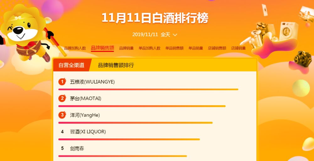 苏宁超市订单量同比增长287%,爆款产品整箱茅台赖茅传承蓝53度同比增长637%,蓝月亮洗衣液大包装套装同比增长283%,三只松鼠零食双十一定制款大礼包销售超过10万包。11日当天,悟空榜数据显示,白酒品牌销售额排行榜上,五粮液、茅台和洋河位居前三强。