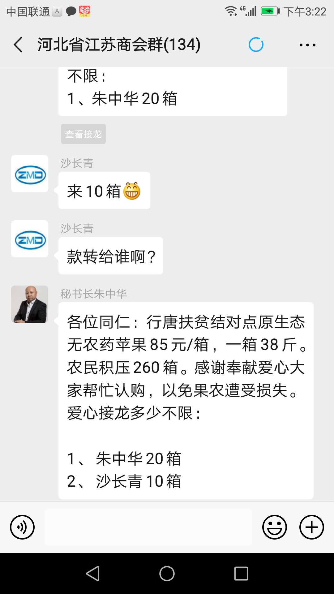 商会秘书处在第一时间得知此消息后,为了帮助果农减少不必要的损失,经请示商会领导,在商会微信会员群中发起了爱心苹果认购活动。信息一经发出,不少会员纷纷致电秘书处,询问相关情况,积极踊跃、争先恐后进行认购接龙。短短两天时间,该村滞销的近一万斤苹果就销售一空,解决了果农的燃眉之急,也充分体现了苏商大爱情怀。