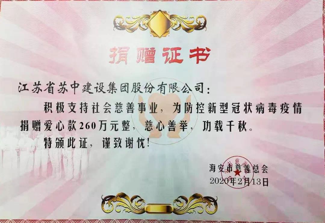 此次抗击疫情,河北省江苏商会会长单位苏中建设共捐赠260万元,其中100余万元购买抗击疫情医疗设备、消毒仪器,支持武汉抗击疫情;另160万元捐赠海安市慈善总会,定向用于支持家乡抗击疫情,其中海安市人民医院80万元,南莫中心卫生院50万元,曲塘中心卫生院30万元。