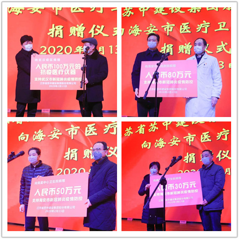 海安市人民医院院长张建平代表受赠方海安市人民医院、南莫中心卫生院、曲塘中心卫生院对苏中建设彰显出的责任担当和善行义举表示感谢。他指出,疫情发生以来,全院所有医护人员均以不同的姿态、同样的责任全力做好疫情防控和医疗救治工作,海安市人民医院承诺一定把捐赠的款项用在疫情防控最需要的地方,让受赠款项物资真正解决燃眉之急,发挥最大的效益。