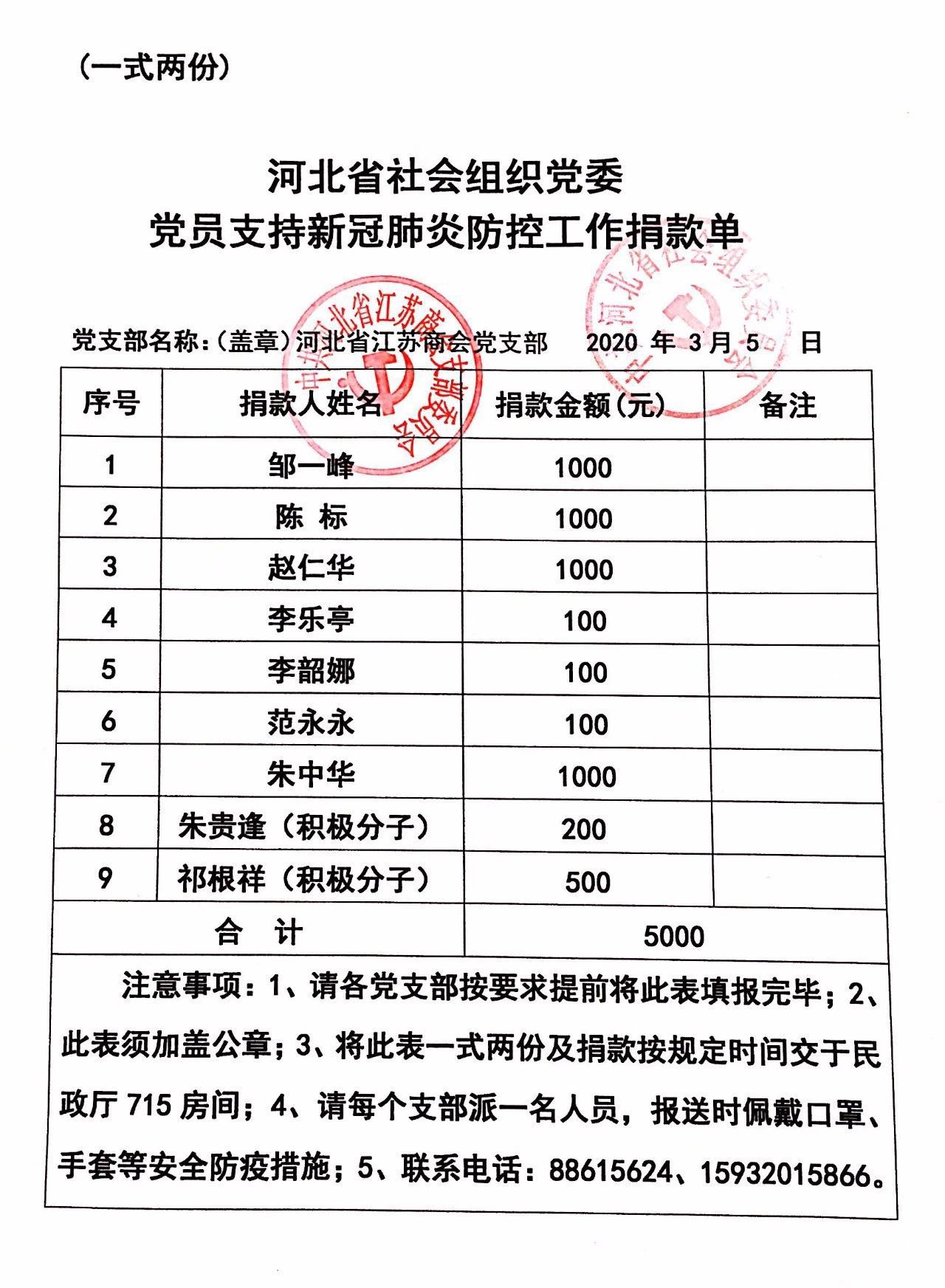书记邹一峰亲自布署,商会党支部所属6名正式党员、一名预备党员和两名入党积极分子就共9人,大家积极响应、踊跃参加,通过微信、支付宝等线上方式进行捐款。100元、200元、500元、1000元……仅一下午捐款累计5000元。本次捐款实现了党员全覆盖,参与率100%,受到河北省社会组织党委和省委组织部的认可和赞赏。