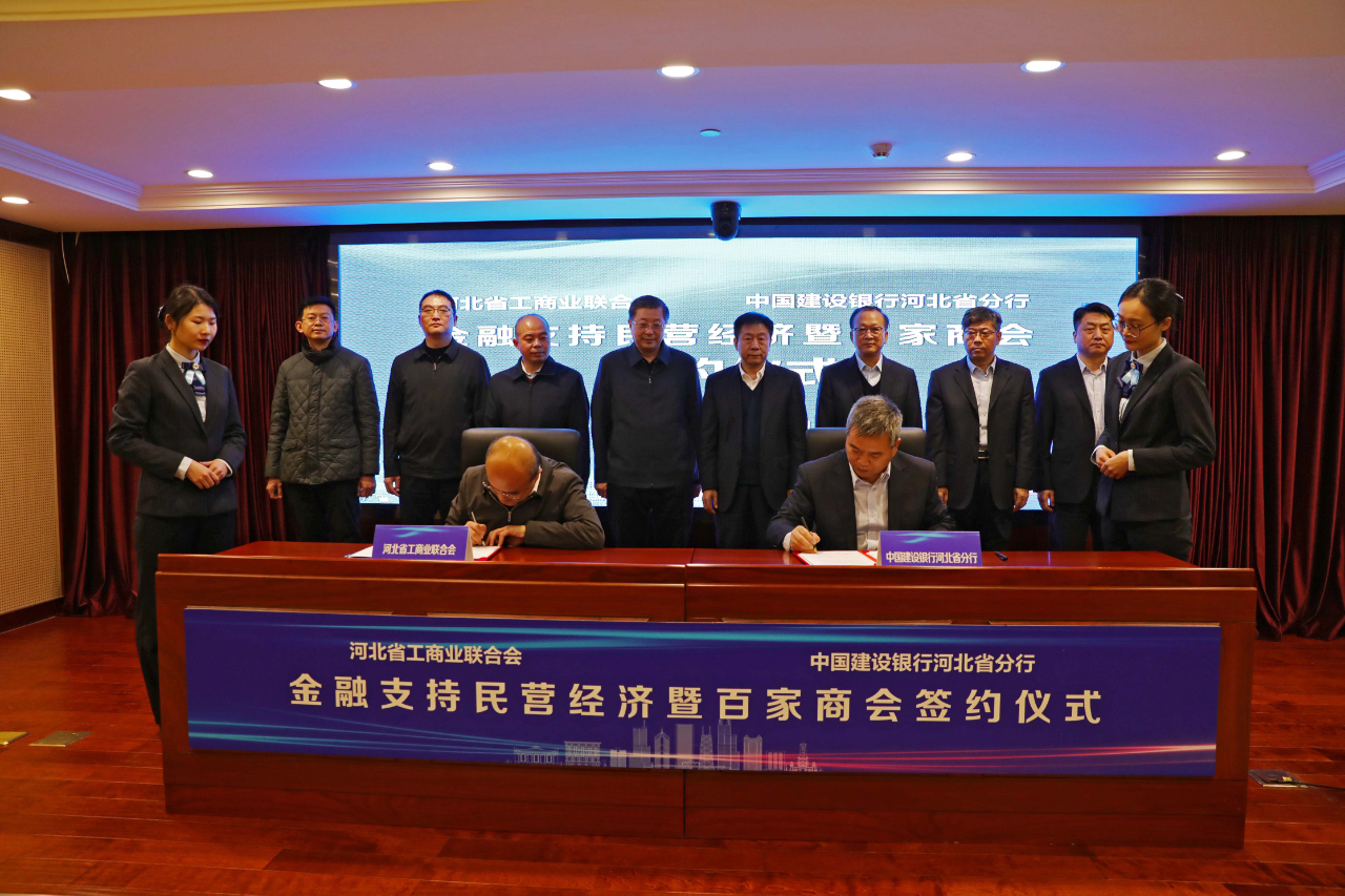 12月28日,由河北省工商联、建设银行河北省分行联合组织的“金融支持民营经济暨百家商会签约仪式”在省建行会议室举行。河北省工商联主席、省总商会会长刘劲松,河北省工商联副主席、省总商会副会长马强,建设银行河北省分行党委书记、行长陈中新,建设银行河北省分行党委委员、副行长王东及省工商联相关处室负责人、各市工商联负责人、商会及企业家代表,建设银行河北省分行相关部门负责人、各二级分行负责人参加签约仪式。