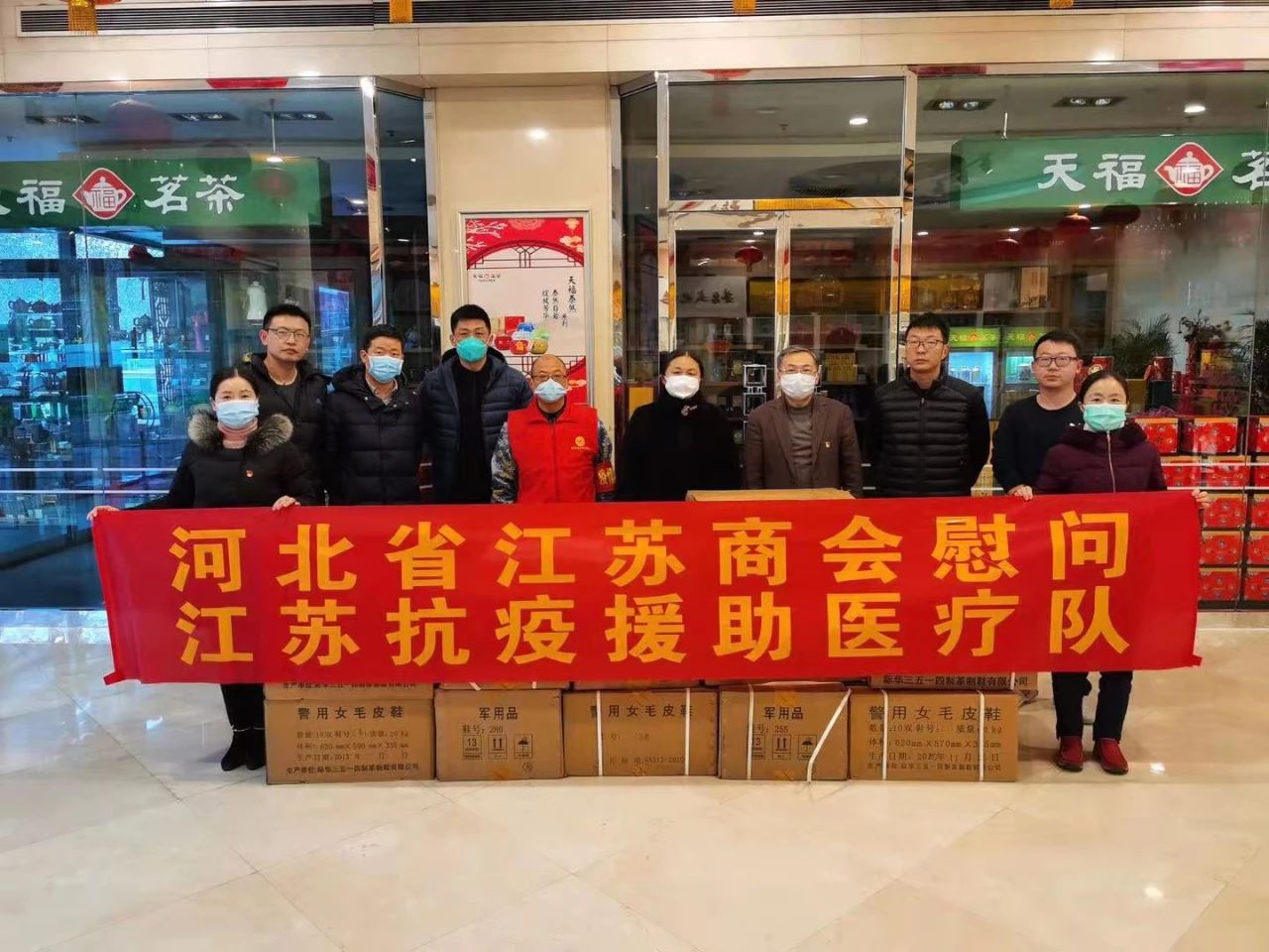 在得知家乡医疗队出发匆忙防寒保暖衣物紧缺的消息后,河北省江苏商会在会长王义宏的指挥下,克服困难迅速采购了一批防寒军警靴等防寒物资。副会长万国红不顾连日来奋斗在抗疫一线的疲惫,带着防寒物资和自己筹集的酒精消毒片等送到江苏医疗队驻地。万国红表示,家乡医疗队临危受命,舍小家为大家,彰显了医务工作者救死扶伤的崇高职业操守,是我们江苏人的骄傲和自豪。
