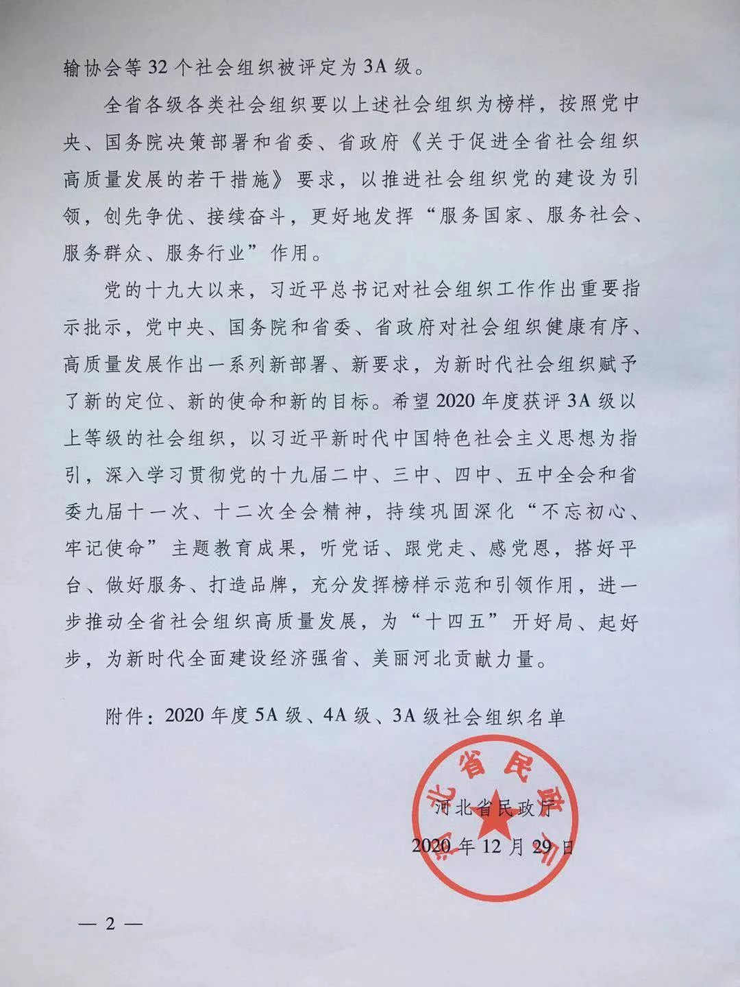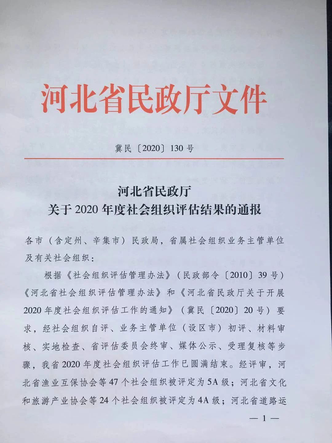 近日,河北省民政厅下发《关于2020年度社会组织评估结果的通报》,通报指出,经过社会组织自评、业务主管单位初评、材料审核、实地检查、省评估委员会终审、媒体公示、受理复核等步骤,河北省江苏商会等47个社会组织被评定为5A级。这是我会继2014年被评为5A级社会组织后再一次获此殊荣。