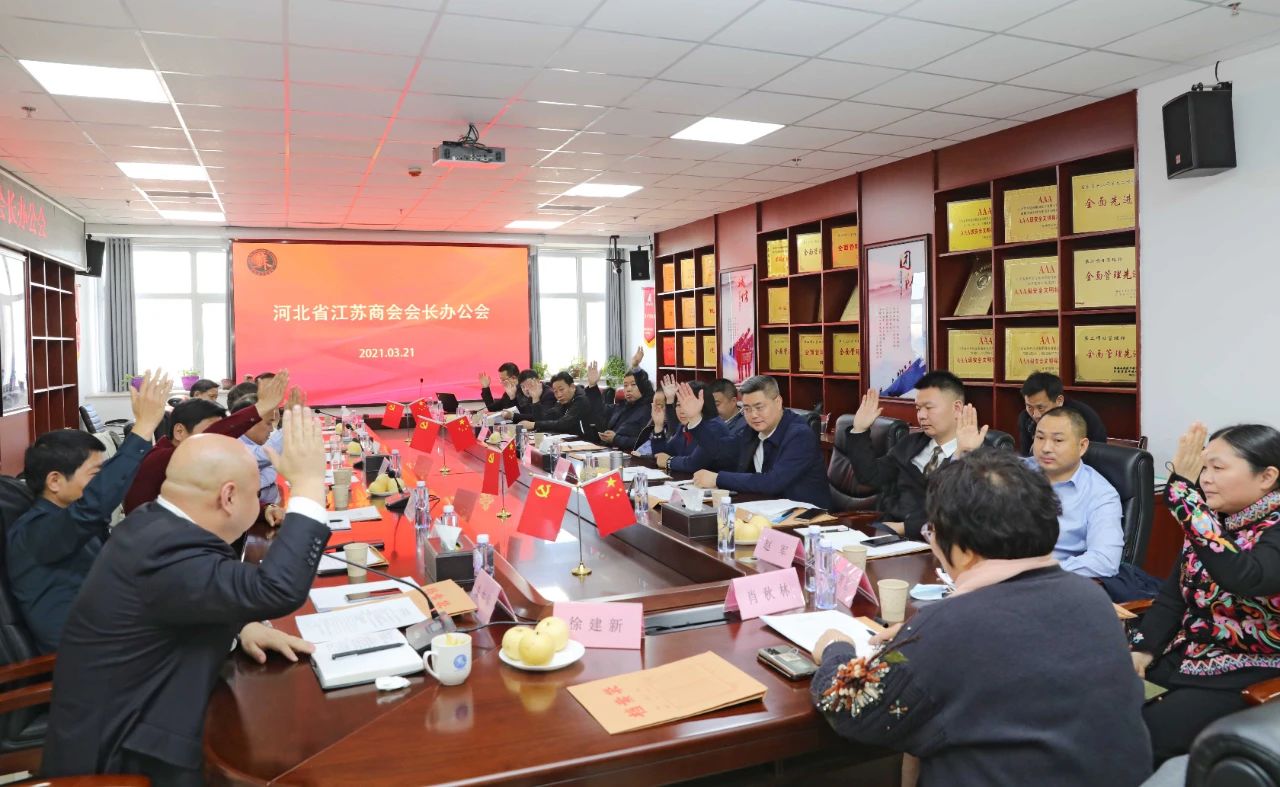 3月21日,河北省江苏商会在石家庄召开了2021年度第一次会长办公会,组织商会领导班子成员开展以学党史、学两会精神为主要内容的教育活动。会长王义宏出席会议并作重要讲话,执行会长茅 兵,党支部书记邹一峰,常务副会长赵仁华、杨静、杨勇、云元枝、夏苏闽、仇建刚、朱华山、郭可钰,副会长王生明、张兆拥、李小平、万国红、王春、黄旭东、赵军等参加会议。副会长兼秘书长朱中华主持会议。