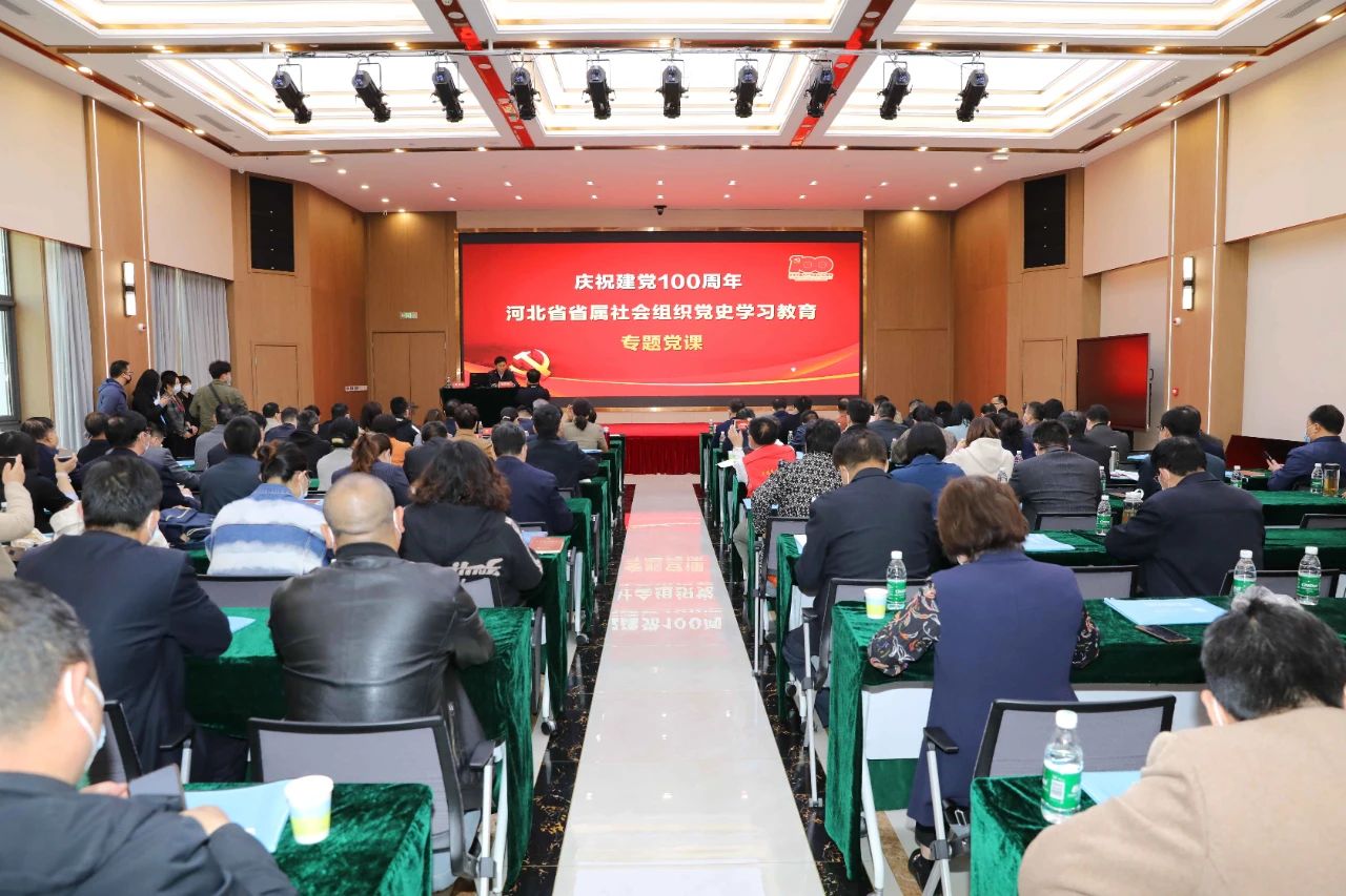 为深入开展党史学习教育迎接建党100周年,河北省社会组织委员会于4月8日在石家庄乐仁堂健康文化科技产业园举办了省属社会组织党史学习教育专题党课。河北省民政厅二级巡视员、省社会组织党委副书记郭百服主持党课,省社会组织党委所属各党(总)支部负责人以及2018年以来新发展的党员共计300余人参加党课教育。河北省江苏商会党支部书记邹一峰、新发展党员朱中华参加了此次活动。