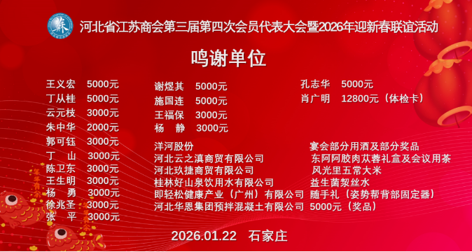 旧岁已展千重锦,新年再进百尺竿。 此次大会,不仅是总结过往的节点,更是启航未来的号角。全体在冀苏商必将以此次盛会为动力,继续弘扬“厚德、崇文、实业、创新”的苏商精神,以更广阔的视野、更团结的姿态、更坚实的步伐,携手并肩,为苏冀两地的繁荣发展贡献磅礴力量!