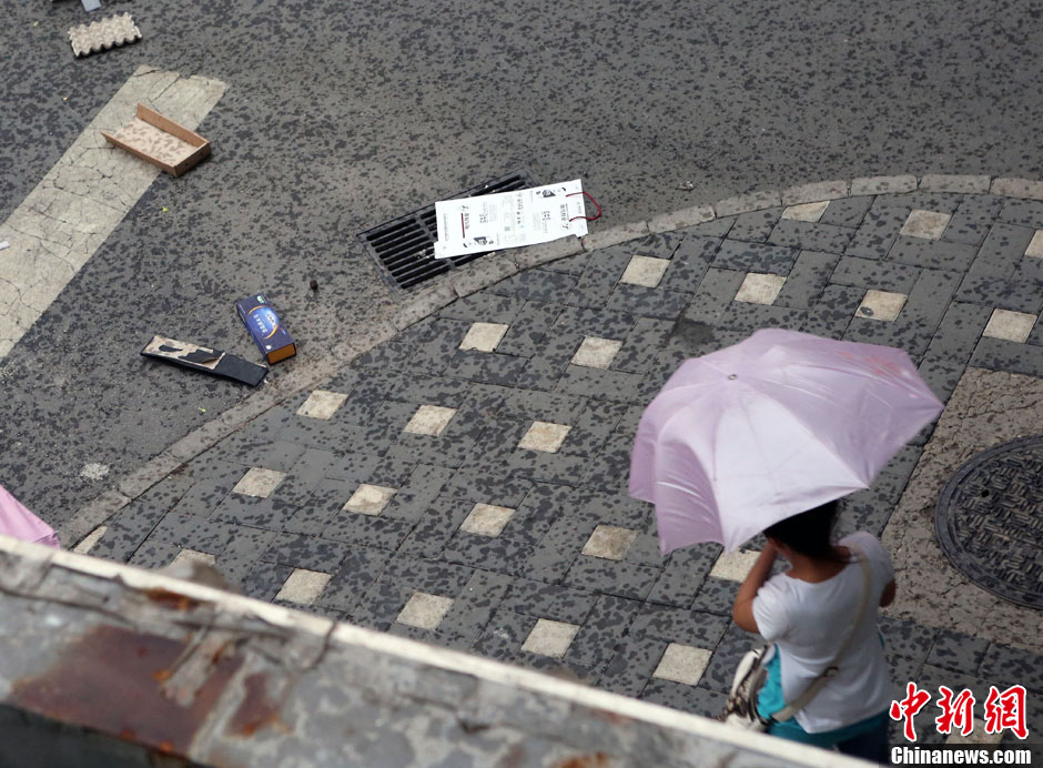 7月4日下午5时,北京发布雷电黄色预警,自西向东将出现雷电天气,局地短时雨强较大伴有冰雹或短时大风。图为行人撑伞顶风而行,地面上吹散着各种物品。中新社发张家瑞摄