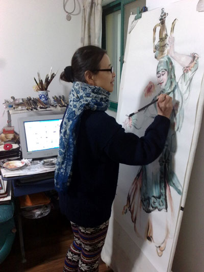 多年以后,当我终于有时间加入舞蹈者队伍的时候,那翩翩起舞的姿态、起伏翻转的跳跃、回眸一顾的神情、美妙的音乐、斑斓的服装、变幻的灯光……,我感动着,享受着。美哉舞者!舞蹈给了我无限的创作灵感与冲动,使我从欣赏、赞美中升华。我感悟到在神圣的艺术殿堂里,舞蹈和绘画其实是一对孪生的精灵。我萌生了用酣畅淋漓的笔墨,将舞蹈的美妙画出来,呈现给大家,让人们去仰望舞蹈与绘画之美。我心中升起了一道靓丽的风景。我感受着舞者的欢快,体验着创作的孤独,开始与舞蹈、绘画一同深呼吸。命运使然,我有幸成为国画大师史国良教授的学生。