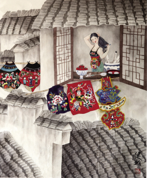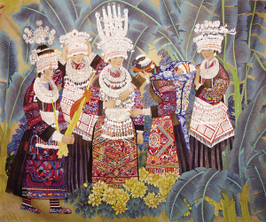 毕业于南京师范大学美术系中国画专业的孙健彬,擅画苗乡重彩人物风情,他曾数十次赴云南贵州采风写生,尤喜收集当地的刺绣资料,每收到一套完整的刺绣服装便欣喜不已,这些服装上原生态的民族艺术则成了他灵感的源泉,“穿着这些服装的女孩十分入画”,孙健彬说,“往往直接画来就是精美的画面”,他经常深入苗家体验生活,与当地人同吃同住,姊妹节上苗族女孩子的刺绣、象征富有的银饰都在他的作品中得到充分展现,“我特别欣赏那种大气磅礴、正气浩然的美”,孙健彬介绍,他又从敦煌、永乐宫壁画得到启发,喜爱雍容富丽、色彩缤纷的审美气象,因此,其作品中的人物经常饱含健康、明快的神采,他的色彩则打破了传统水墨的表现方法,往往以综合手段营造出西画的华美效果。
