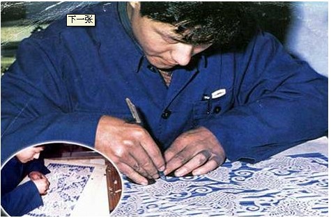 南通民间蓝印花布,全凭人工手纺、手织、手染而成,其图案全凭手工镂刻,每幅刻好的纸版都似剪纸艺术。花版镂空后,经刷桐油加固,然后再用石灰拌黄豆粉,加水调成糊状,通过花版括在布上。待灰浆晾干后,投入缸内染色,染成的布呈深蓝色。染好的布去了浅浮灰浆,密封处露出本色。灰浆块面大的地方,灰层在染色的卷动中自然裂开,蓝靛随着裂缝渗透到坯布上,留下了人工无法描绘的自然冰纹。自然冰纹是蓝印花布艺术的灵魂。