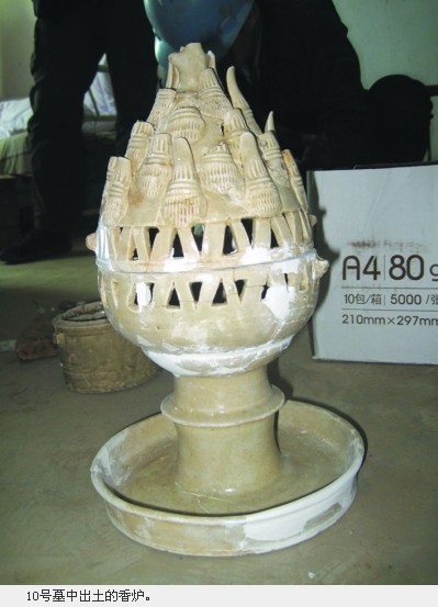 然而遗憾的是,因为早年遭到盗挖,整个墓葬群并没有发现太多文物。不过其中最大的10号墓,发现了几件比较精美的文物。其中有一个青瓷的香炉,上部为镂空烧制,配上山形的配饰,非常精美。两只滑石雕刻的小猪,憨态可掬,表明墓主人身份高贵。还有两块墓砖上,雕刻着类似道符的花纹,不过具体什么寓意,目前还没有成功解读。