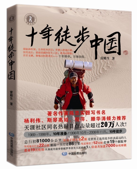 他是谁?他就是雷殿生,2007年首届“中国十大徒步人物”,中国徒步史上第一位成功穿越罗布泊的孤胆英雄!他行走归来后先后接受了包括中国中央电视台以及众多地方台的采访,各大媒体杂志对他的经历也进行了大篇幅的报道。同时受二炮野战部队、成都军区以及北京大学、清华大学、中央财经、上海交通大学、同济大学、哈尔滨工程大学、哈尔滨工业大学等各大高校邀请做过巡回讲座。心系社会的雷殿生,在北京市昌平区建立了“雷殿生爱国主义教育基地”,供广大市民参观学习。雷殿生被广大网友、大学生、驴友视为精神领袖,孤身一人走天涯的他并不孤单,因为,有一大群人的精神在跟着他流浪!他在天涯论坛上的帖子,《十年徒步中国——我只是匆匆行走的一个过客,追寻着一个梦。 》,在不到60天的时间里点击量就已经超过了62万,曾经创下了单日点击量超过20万的记录,受到了广大网友的热追。在这十年间,他关注环保、民俗、探险,他乐观的生活态度,坚韧不拔的意志都是当代人学习的榜样。也是媒体需要正面宣传的人物。雷殿生先生最近力作《十年徒步中国》己由中国地图出版社出版发行,这本书浓缩了雷殿生十年来心路历程。雷殿生的徒步壮举受到了社会各界人士的高度关注,很多读者也是对此书翘首以盼。《十年徒步中国》这本书的书名是由著名作家陈忠实题写,同时杨利伟、斯琴高娃、倪萍、滕华涛倾力推荐。
