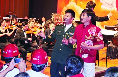 江苏籍歌手、二炮文工团男高音歌唱家乔军和梁智等朋友们的爱心演唱会,19日在国家大剧院举行。“大衣哥”朱之文、青年歌唱家楼兰、王庆爽、孔子雯等作为嘉宾登台助阵。乔军和朱之文联手演唱《农民兄弟》(如图),献给受邀到现场的30名农民工兄弟。当天,乔军演绎了《儿行千里》《为人民服务》《阳光下的守望》等6首歌。“我以前在工地上打工时,从来没想过自己有一天能登上国家大剧院的舞台。”身穿红色唐装的朱之文,对台下的农民工兄弟说,“我最高兴的是为自己的民工兄弟唱歌。”