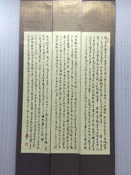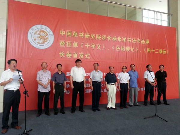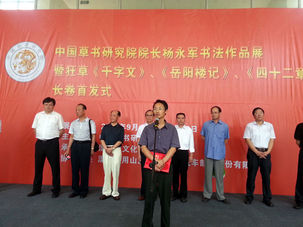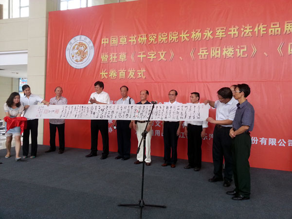 中国江苏网9月12日讯(记者高利平):今天上午,由中国草书研究院主办、溧阳市文广新局承办的“杨永军教授书法作品展”在溧阳市文化艺术中心开幕。展览共展出了杨永军教授作品百余幅,包括篆、隶、草、行、楷等多种书体,还有他酝酿十年,集古今草书大家之长,精心创作的长258米、高1.46米的鸿篇巨制《深龙卷》,堪称一绝。