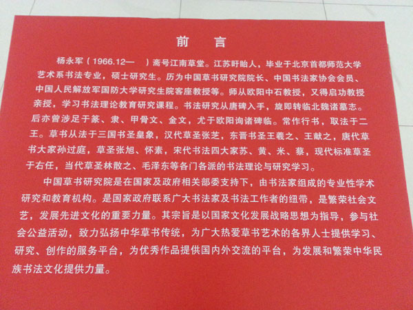 杨永军是中国解放军国防大学研究院教授、中国书法文化研究所研究院、中国书法家协会评审委员会委员、中国书法家培训协会中心教授。其艺术特色是真、篆、隶、草、行博涉,各种书体兼通,尤其以草书为佳;在博学精取的基础上,着力追求自己的艺术个性,下笔沉着痛快,运笔自然灵动,行笔率真随意,转笔洒脱圆浑,落笔遒劲有力。杨教授经十年酝酿精心创作的鸿篇巨制《深龙卷》长258米、高1.46米,全卷书录张芝的《冠军诗卷》、张旭的《古诗四首》、怀素的《自叙帖》、《四十二章经》、唐诗三十四首、毛泽东《诗十首》等名篇佳作。在中国书法史上堪称第一书法长卷,现已被吉尼斯定为《世界之最》。其他参展的百余幅作品均显示出杨教授在章法上随心所欲,格调清新高雅,沉着端庄,俊朗而又飘逸,古朴而又华美。本次展览将持续5天,广大书法爱好者可以前往欣赏。