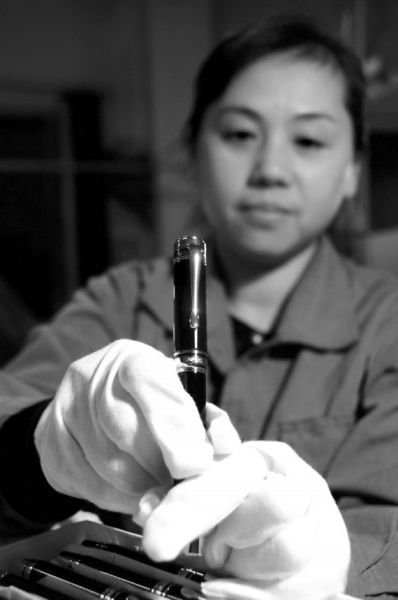 上海英雄钢笔厂有限公司总经理董文斌说,产品从10月1日开始加班加点制作,光笔尖就经历了37道工序。“第五道传统的榫卯结构将节能的LED光源安置在内。